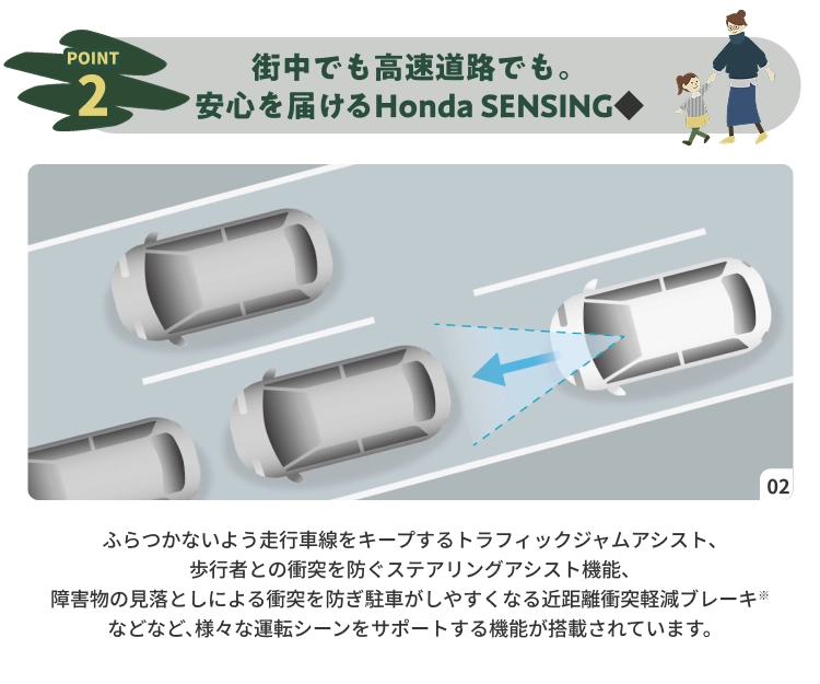 ◆Honda SENSINGは、ドライバーの運転支援機能のため、各機能の能力(認識能力・制御能力)には限界があります。各機能の能力を過信せず、つねに周囲の状況に気をつけ、安全運転をお願いします。