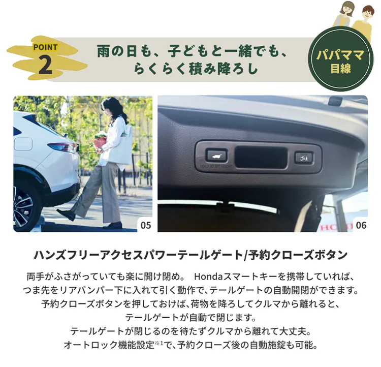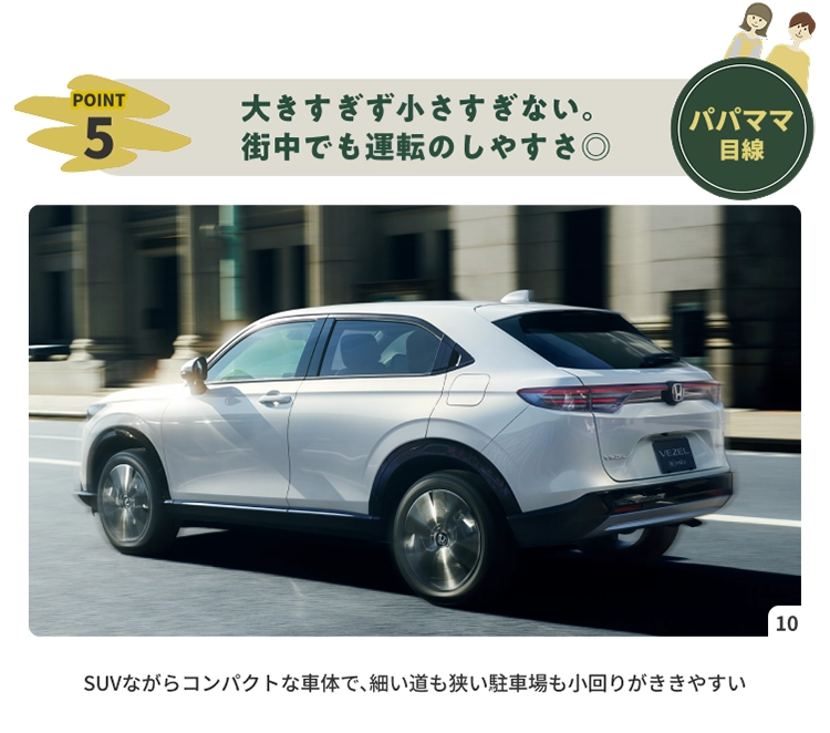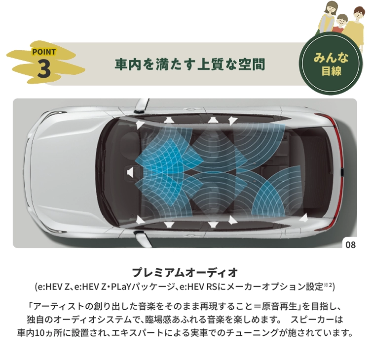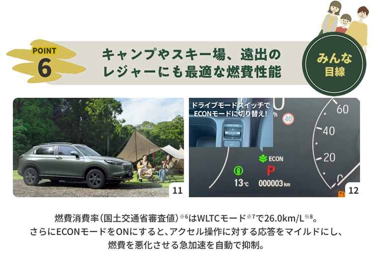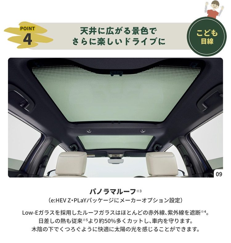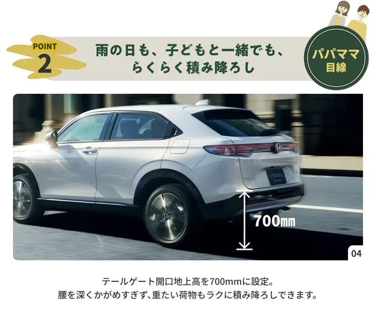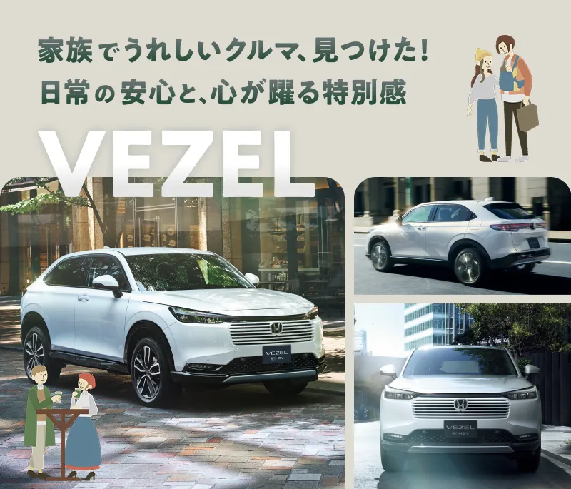 ※1:カスタマイズ画面内の「車両設定」より、設定が可能です。詳しくは販売会社にお問い合わせください。 ※2:「プレミアムオーディオ」をお選びいただいた場合、標準装備のスピーカーに替わり、装着されます。 ※3:パノラマルーフ装着車はお選びいただけない場合があります。詳しくは販売会社にお問い合わせください。 ※4:IR/UV:90%以上カット ※5:2021年4月時点。過去のHonda国内モデルとの比較。 ※6:燃料消費率は定められた試験条件での値です。お客様の使用環境(気象、渋滞等)や運転方法(急発進、エアコン使用等)に応じて燃料消費率は異なります。 ※7:WLTCモード:市街地、郊外、高速道路の各走行モードを平均的な使用時間配分で構成した国際的な走行モード。 ※8:e:HEV X(FF)の場合。 Photo【01】:ヴェゼル e:HEV Z(FF) 車両本体価格(消費税10%込み)3,268,100円★ 価格には写真の有料色の価格は含まれておりません。 ボディーカラーはプラチナホワイト・パール(有料色:38,500円高) ■小物類は撮影のために用意したものです。 ■積載物の形状、サイズ等によっては積めない場合があります。■安全のため走行の際は荷物をしっかりと固定してください。 Photo【02】:ヴェゼル e:HEV Z(FF) 車両本体価格(消費税10%込み)3,268,100円★ 価格には写真の有料色の価格は含まれておりません。 ボディーカラーはプラチナホワイト・パール(有料色:38,500円高) Photo【03・10】:ヴェゼル e:HEV Z(FF) 車両本体価格(消費税10%込み)3,268,100円★ 価格には写真の有料色及びメーカーオプションの価格は含まれておりません。 ボディーカラーはプラチナホワイト・パール(有料色:38,500円高) メーカーオプション(後退出庫サポート、Honda CONNECTディスプレー+ETC2.0車載器+ワイヤレス充電器、マルチビューカメラシステム+プレミアムオーディオ:374,000円高)装着車 ■ETC2.0車載器を使用するには、別途決済用のETCカード、セットアップ作業(セットアップ費用)が必要となります。 Photo【04】:ヴェゼル e:HEV Z(FF) 車両本体価格(消費税10%込み)3,268,100円★ 価格には写真の有料色及びメーカーオプションの価格は含まれておりません。 ボディーカラーはプラチナホワイト・パール(有料色:38,500円高) メーカーオプション(後退出庫サポート、Honda CONNECTディスプレー+ETC2.0車載器+ワイヤレス充電器:231,000円高)装着車 ■ETC2.0車載器を使用するには、別途決済用のETCカード、セットアップ作業(セットアップ費用)が必要となります。 Photo【05】:ヴェゼル e:HEV Z(FF) 車両本体価格(消費税10%込み)3,268,100円★ 価格には写真の有料色の価格は含まれておりません。 ボディーカラーはプラチナホワイト・パール(有料色:38,500円高) ■小物類は撮影のために用意したものです。 Photo【06】:予約クローズボタン Photo【07】:ヴェゼル e:HEV Z(FF) 車両本体価格(消費税10%込み)3,268,100円★ ■イメージ図 Photo【08】:ヴェゼル e:HEV Z(FF) 車両本体価格(消費税10%込み)3,268,100円★ 価格には写真の有料色及びメーカーオプションの価格は含まれておりません。 ボディーカラーはプラチナホワイト・パール(有料色:38,500円高) メーカーオプション(後退出庫サポート、Honda CONNECTディスプレー+ETC2.0車載器+ワイヤレス充電器、マルチビューカメラシステム+プレミアムオーディオ:374,000円高)装着車 ■イラストは機能説明のためのイメージ図です。■ETC2.0車載器を使用するには、別途決済用のETCカード、セットアップ作業(セットアップ費用)が必要となります。 Photo【09】:ヴェゼル e:HEV Z・PLaYパッケージ(FF) 車両本体価格(消費税10%込み)3,699,300円★ 価格には写真の有料色及びメーカーオプションの価格は含まれておりません。 ボディーカラーはシーベッドブルー・パール&シルバー(有料色:27,500円高) メーカーオプション(パノラマルーフ、マルチビューカメラシステム+プレミアムオーディオ:253,000円高)装着車 Photo【11】:ヴェゼル e:HEV X ・HuNTパッケージ(FF) 車両本体価格(消費税10%込み)3,108,600円★ 価格には写真の有料色の価格は含まれておりません。 ボディーカラーはボタニカルグリーン・パール(有料色:38,500円高) Photo【12】:ドライブモードスイッチ/メーターのECON表示 Photo【13】:ヴェゼル e:HEV Z(FF) 車両本体価格(消費税10%込み)3,268,100円★ 価格には写真の有料色の価格は含まれておりません。 ボディーカラーはプラチナホワイト・パール(有料色:38,500円高)