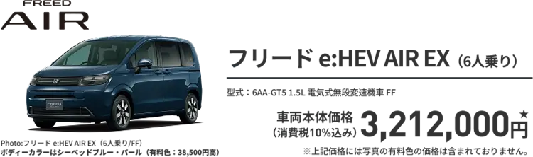 Photo【03】:フリード e:HEV AIR EX(FF/6人乗り) 車両本体価格(消費税10%込み)3,212,000円★ 価格には写真の有料色の価格は含まれておりません。 ボディーカラーはフィヨルドミスト・パール(有料色:38,500円高) インテリアカラーはグレージュ