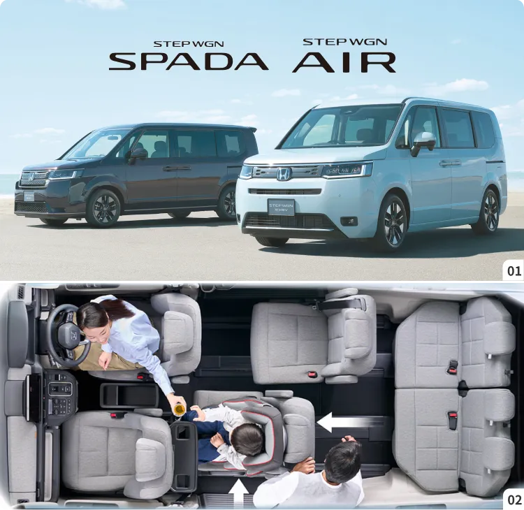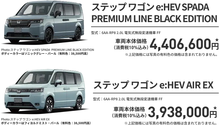 Photo【1】:[右]ステップ ワゴン e:HEV AIR EX 車両本体価格(消費税10%込み)3,938,000円★ 価格には写真の有料色及びディーラーオプションの価格は含まれておりません。 ボディーカラーはフィヨルドミスト・パール(有料色:38,500円高) ディーラーオプション(11.4インチ Honda CONNECTナビ LXM-247VFLi〈取付アタッチメント、パネルキット含む〉:320,100円〈取付工賃別途〉)装着車 [左]ステップ ワゴン e:HEV SPADA 車両本体価格(消費税10%込み)3,998,500円★ 価格には写真の有料色及びディーラーオプションの価格は含まれておりません。 ボディーカラーはトワイライトミストブラック・パール(有料色:38,500円高) ディーラーオプション(11.4インチ Honda CONNECTナビ LXM-247VFLi〈取付アタッチメント、パネルキット含む〉:320,100円〈取付工賃別途〉)装着車 Photo【02】:※助手席側内寄せスライド量が115mmのとき、運転席側は内寄せスライドができません。
