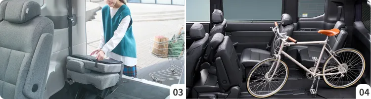3列目シートをらくらく収納!自転車を積んでも4人乗れる広さ。 ベビーカーも畳まずに載せられます。