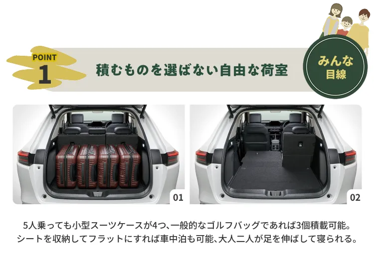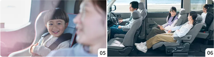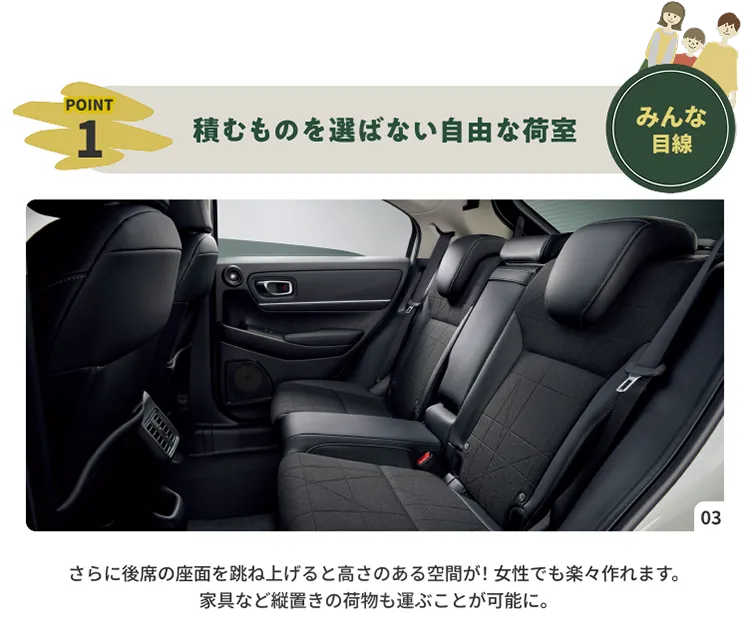 Photo【02】【03】【04】【05】【06】:■インテリアの写真には、カットボディーによる合成写真が含まれます。■写真には、機能説明のための作動イメージが含まれます。■小物類は撮影のために用意したものです。■小物類のサイズ・形状によっては積めない場合があります。■シートアレンジの各操作は、異物をはさんでいないか確認の上、無理な力をかけず確実に行ってください。■安全のため走行の際は荷物をしっかりと固定してください。■安全のため、シートのヘッドレストを下げた状態で走行しないでください。チャイルドシート、ジュニアシート装着時は、それぞれの取扱説明書に従ってご使用ください。■画面はハメコミ合成。■各装備・仕様の詳しい設定につきましては、「主要装備表」「主要諸元表」をご覧ください。