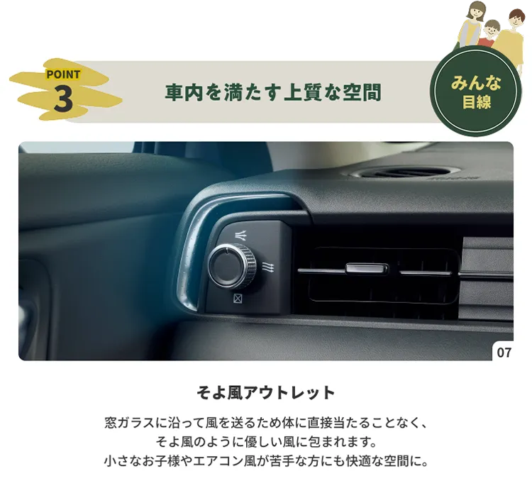 車全体に遮音性を高める工夫を施し、1列目と3列目の会話がしやすい静かな空間に。
