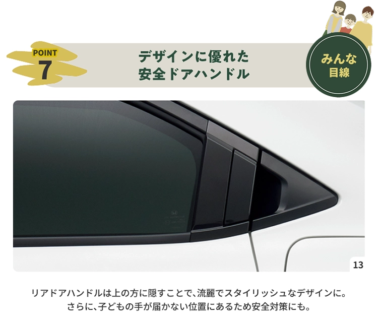 大人用のアシストグリップに加え、小さな子どもの乗り降りに配慮したグリップを設置。